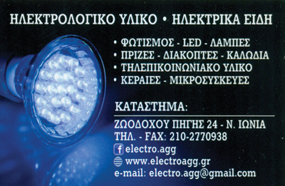 customer tabsΕπικοινωνίαΕίμαστε μία οικογενειακή επιχείρηση που δραστηριοποιείται στην εμπορία ηλεκτρολογικού υλικού από το 1979, κρατώντας την παράδοση της αξιοπιστίας και την άριστη τεχνογνωσία μας. Μέριμνα μας είναι η διατήρηση της ποιότητας των προϊόντων και η προσαρμογή των τιμών μας, σύμφωνα πάντα με τις ανάγκες της εποχής. Αναλαμβάνουμε πάσης φύσεως ηλεκτρολογικές εργασίες και εγκαταστάσεις • Ηλεκτρολογικές εργασίες (βλάβες, επισκευές) • Εγκαταστάσεις, συντηρήσεις και ανακαινίσεις καταστημάτων - οικιών • Μελέτη, συναρμολόγηση και αντικατάσταση ηλεκτρολογικού πίνακα (ανάλογα με τις ανάγκες του Χώρου σας) • Πιστοποιητικά ΔΕΗ • Τοποθετήσεις κλειστών κυκλωμάτων καμερών CCTV • Τοποθετήσεις κεραιών Τηλέφωνο επικοινωνίας για εξωτερικές εργασίες: 693 6844424 ΠΡΟΙΟΝΤΑ• Φωτιστικά - Φωτιστικά από σχοινί - Φωτιστικά από τσιμέντο - Φωτιστικά από γυαλί - Φωτιστικά από μέταλλο - Πολύφωτα - Πλαφονιέρες - Πορτατίφ - Ορθοστάτες • Λαμπτήρες LED - Μεγάλη ποικιλία σε λάμπες LED και φωτιστικά LED, με 2 ΧΡΟΝΙΑ ΕΓΓΥΗΣΗ και άμεση αντικατάσταση σε περίπτωση βλάβης • Λαμπτήρες Edison - Vintage - Λάμπες διακοσμητικές Vintage • Μεγάλη ποικιλία σε πρίζες και διακόπτες (σχέδια και αποχρώσεις) • Σύστημα παρακολούθησης κλειστού κυκλώματος καμερών CCTV (κάμερες, κάμερες IP, καταγραφικά, monitors. Δυνατότητα παρακολούθησης εξ αποστάσεως από υπολογιστή, tablet ή smartphone). • Θερμαντικά σώματα - Σόμπες χαλαζία - Θερμοπομπούς - Καλοριφέρ λαδιού - Αερόθερμα μπάνιου - Αερόθερμα - Θερμαινόμενα υποστρώματα - Θερμαινόμενες κουβέρτες - Σόμπες υγραερίου • Ανεμιστήρες - Ανεμιστήρες οροφής - Ανεμιστήρες ορθοστάτες - Ανεμιστήρες επιδαπέδιοι - Ανεμιστήρες τοίχου - Ανεμιστήρες με υδρονέφωση (Για επαγγελματικούς χώρους και οικιακούς) • Μικροσυσκευές - Ηλεκτρικά είδη - Φουρνάκια - Φούρνοι μικροκυμάτων - Ηλεκτρικά BBQ - Ηλεκτρικές εστίες - Ψηστιέρες - Τοστιέρες - Μπλέντερ - Μίξερ - Καφετιέρες - Βραστήρες - Σκούπες - Ηλεκτρικά σίδερα - Είδη προσωπικής περιποίησης - Ζυγαριές - Υποστρώματα - Αφυγραντήρες • Τηλεφωνία - Σταθερά τηλέφωνα - Ασύρματα τηλέφωνα • Τηλεπικοινωνιακό υλικό - Καλώδια τηλεφώνου - Καλώδια ίντερνετ - Φίλτρα ADSL - Φις αντάπτορες τηλεφώνου • Κεραίες - Κεραίες εξωτερικές ιστού -Κεραίες ψηφιακές μικρές (κατάλληλες για μπαλκόνια και για camping) - Κεραίες εσωτερικές (Για τέλειο ψηφιακό σήμα) • Ρολόγια - Ξυπνητήρια - Ρολόγια αναλογικά - Ρολόγια ψηφιακά μπαταρίας και ρεύματος - Ραδιορολόγια • Ραδιοφωνάκια - Τρανζίστορς Για παραγγελίες επικοινωνήστε στο 210-2770938. Επισκεφθείτε τη σελίδα μας στο facebook και περιηγηθείτε στα άλμπουμ μας. ΗλεκτρολόγοιΗλεκτρολογικά Είδη και ΥλικάΔόμηση - ΚατοικίαΖωοδόχου Πηγής 24, Νέα ΙωνίαΝΕΑ ΙΩΝΙΑ ΑΤΤΙΚΗΣΑΤΤΙΚΗ 2102770938 6936844424electro.agg@gmail.comwww.electroagg.gr Το προτείνω (έχει προταθεί 1 φορές) ΦωτογραφίεςFacebook LikeShare on FacebookTweet Widget