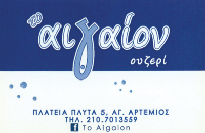 customer tabsΕπικοινωνίαΖωντανή Μουσική κάθε Σάββατο βράδυ και Κυριακή μεσημέρι.Μεζεδοπωλεία - Ουζερί - ΤσιπουράδικαΔιασκέδαση - ΕστίασηΠλατεία Πλυτά Αμβροσίου 5, Άγιος Αρτέμιος, ΑθήναΑΘΗΝΑ ΑΤΤΙΚΗΣΑΤΤΙΚΗ 2107013559alexopoulou_aigaion@gmail.comTo Aigaion Το προτείνω (έχει προταθεί 0 φορές) ΦωτογραφίεςFacebook LikeShare on FacebookTweet Widget