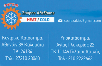 customer tabsΕπικοινωνίαΨυκτικές Εγκαταστάσεις - Είδη και ΥλικάΨυκτικοίΜελέτη,Τοποθέτηση, Επισκευή, Συντήρηση ΚλιματιστικώνΨυκτικά ΜηχανήματαΔόμηση - ΚατοικίαΛοιπάΑθηνών 89, ΚαλαμάταΑγίας Γλυκερίας 22Α, ΓαλάτσιΓΑΛΑΤΣΙ ΑΤΤΙΚΗΣΑΤΤΙΚΗ 2721028060 6973008863spalexakis@gmail.com Το προτείνω (έχει προταθεί 1 φορές) ΦωτογραφίεςFacebook LikeShare on FacebookTweet Widget