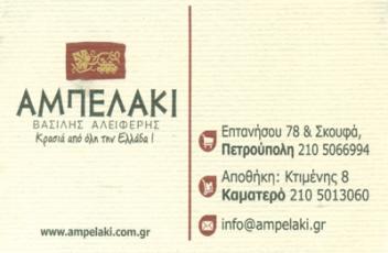 customer tabsΕπικοινωνίαΤο «Αμπελάκι» δραστηριοποιείται στον χώρο του ποιοτικού κρασιού από το 2000. Εδρεύει στην Πετρούπολη Αττικής σε ιδιόκτητες εγκαταστάσεις που ξεπερνούν τα 1000τ.μ.και διαθέτει κατάστημα λιανικής πώλησης στην οδό Επτανήσου 78.Η εταιρεία ιδρύθηκε με πολύ μεράκι και αγάπη για τα κρασιά από τον Βασίλη Αλειφέρη.Το «Αμπελάκι» διήνυσε πολύ δρόμο και η εξέλιξη της πορείας του αντικατοπτρίζει τιςαλλαγές που έλαβαν χώρα στην παραγωγή οίνου στην Ελλάδα.Η εταιρεία έχει εξασφαλίσει τη συνεργασία με επιλεγμένα οινοποιεία και τους καλύτερουςπαραγωγούς από όλη την Ελλάδα, καλύπτοντας έτσι ένα μεγάλο φάσμα των απαιτήσεων του σύγχρονου καταναλωτή.Εδώ και αρκετά χρόνια αντιπροσωπεύει, μεταξύ άλλων, και τα φημισμένα κρασιά ΖΙΤΣΑΣ ΒΟΡΟΙΝΟΣτης ΖΟΙΝΟΣ Α.Ε., τον Οινοποιητικό Συνεταιρισμό Τυρνάβου, το Οινοποιείο Βαένι Νάουσσας,το Οινοποιείο Αμαργιωτάκη απο την Κρήτη, το κτήμα Μπίζιος απο τη νεμέα, το ΟινοποείοΚαραμήτρος Μεσενικόλα απο την καρδίτσα κ.α.Είδη ΟινοποιίαςΟινοπνευματοποιία - Οινοποιία - Ποτοποιία - ΖυθοποιίαΛοιπάΕπτανήσου 78 & Σκουφά, ΠετρούποληΚτιμένης 8, ΚαματερόΠΕΤΡΟΥΠΟΛΗ ΑΤΤΙΚΗΣΚΑΜΑΤΕΡΟ ΑΤΤΙΚΗΣΑΤΤΙΚΗ 2105066994 2105013060 6972774524info@ampelaki.com.grwww.ampelaki.com.gr Το προτείνω (έχει προταθεί 0 φορές) ΦωτογραφίεςFacebook LikeShare on FacebookTweet Widget