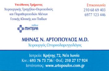 customer tabsΕπικοινωνίαΔιευθυντής ΩΡΛ Χειρουργικού Τμήματος Τραχήλου - Θυροειδούςστο Νοσο/μείο "Μητέρα"Δέχεται Δευτέρα - Πέμπτη 17:30 -19:30 με ραντεβού στο Ιατρείο και Καθημερινά πρωί στο Νοσοκ/μείο "Μητέρα"ΩτορινολαρυγγολόγοιΥγείαΚρήτης 72, Νέας Ιωνίας, ΑττικήΝΕΑ ΙΩΝΙΑ ΑΤΤΙΚΗΣΑΤΤΙΚΗ 2106869403 6937673736 697712344621027179242106869197artminas@yahoo.grmartopoulos@mitera.grwww.artopoulos.com.grwww.mitera.gr Το προτείνω (έχει προταθεί 0 φορές) ΦωτογραφίεςFacebook LikeShare on FacebookTweet Widget
