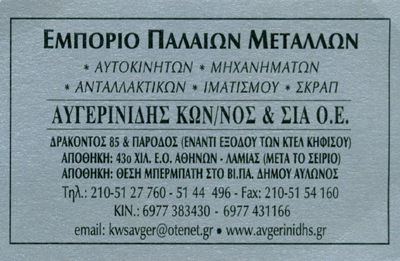 customer tabsΕπικοινωνίαΔραστηριοποιούμαστε με επιτυχία στον χώρο της συλλογής,εμπορίας και ανακύκλωσης μετάλλων.Πωλήσεις στρατιωτικών οχημάτων, όπλων, πυρομαχικών,ειδών ένδυσης και παντός τύπου στρατιωτικού εξοπλισμού του Ε.Σ.Εμπόριο παλαιών μετάλλωνΣτρατιωτικά υλικά ΑνακύκλωσηΛοιπάΔράκοντος 85, ΠεριστέριΠΕΡΙΣΤΕΡΙ ΑΤΤΙΚΗΣΑΤΤΙΚΗ 2105144496 2105127760 6977431166 69773834302105154160kwsavger@otenet.grwww.avgerinidis.gr Το προτείνω (έχει προταθεί 0 φορές) ΦωτογραφίεςFacebook LikeShare on FacebookTweet Widget