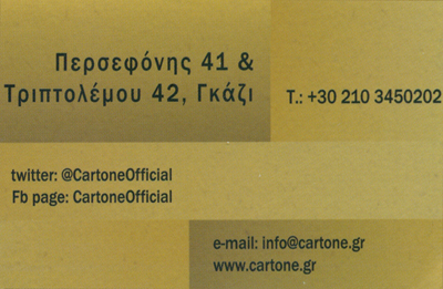 customer tabsΕπικοινωνίαΣνακ, σαλάτες, ζυμαρικά, πιάτα με εξωτικές νότες και steaks συναντούνmainstream μουσικές σε ένα νεανικό all-day χώρο, ακριβώς απέναντι απότο μετρό του Κεραμεικού, που παίζει από άκρη σε άκρη με την έννοια τουχαρτονιού. Σκεύη μαγειρικής, αυτοκινητάκια, βέσπες, ακόμη κι έναολόκληρο τζιπ σε φυσικό μέγεθος από πεπιεσμένο χαρτί που δεσπόζειστο ντεκόρ «κινούνται» στο ρυθμό του ονόματος.Καφενεία - Καφετέριες - Καφέ Μπαρ - ΜπαρΣνακΕστιατόρια και ΤαβέρνεςΔιασκέδαση - ΕστίασηΤουρισμόςΠερσεφόνης 41 και Τριπτολέμου, ΑθήναΑΘΗΝΑ ΑΤΤΙΚΗΣΑΤΤΙΚΗ 2103450202info@cartone.grinfo@cartonegazi.grwww.cartonegazi.grCartone Το προτείνω (έχει προταθεί 0 φορές) ΦωτογραφίεςFacebook LikeShare on FacebookTweet Widget