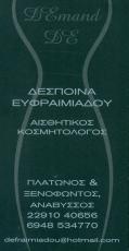customer tabsΕπικοινωνίαΗ Κυρία Ευφραιμιάδου Δέσποινα είναι αριστούχος τελειόφοιτοςτου ΤΕΙ Αισθητικής και Κοσμητολογίας Αθηνών.Έχει συμμετάσχει σε πλήθος σεμιναρίων που αφορούν το αντικείμενοέχοντας πολυετή εμπειρία στο χώρο.Ενδεικτικά έχει υπάρξει υπεύθυνη σε μεγάλα κέντρα SPA,καθηγήτρια σε δημόσια και ιδιωτικά ιδρύματα και έχει συμμετάσχεισε τηλεοπτικές εκπομπές για τη παρουσίαση συμβουλών - θεραπειών ομορφιάς.Τη δεδομένη στιγμή διατηρεί δικό της χώρο αισθητικής στηνΑνάβυσσο με την επωνυμία DEMAND (Πλάτωνος & Ξενοφώντος 1).Διαθέτουμε σύγχρονα μηχανήματα:LASER αποτρίχωσηςIADL, αποτρίχωσηHIFU - Άμεσο liftingCAVITACTION - Μεσοθεραπεία, καύση λίπουςVACCUM - Υπεραιμία, αδυνάτισμα, καταπολέμηση κυτταρίτιδαςRADIOFREQUENCY RF - Ανάπλαση και σύσφιξηMICRODERMOABRASION - Εξάλειψη ρυτίδων, μείωση διευρυμένωνπόρων, μείωση ουλών και δυσχρωμιών, λείανση της επιδερμίδας, αύξηση κολλαγόνουLYMPHOIONIE - Λεμφικό μασάαζ για κυτταρίτιδα και οιδήματαTRANS - Παθητική γυμναστική με παλμοσειράSTETCHING - Διατατική γυμναστική τεσσάρων χρόνωνΘεραπείες προσώπου: Βαθύ καθαρισμό προσώπου με ατμό (ενυδάτωση, ανάπλαση, σύσφιξη) ΑΗΑ peelings / οξέα φρούτων που επιτυγχάνουν: Εξάλειψη ρυτίδων,μείωση διευρυμένων πόρων, καταπολέμηση ακμής, λείανση της επιδερμίδας,έλεγχος της λιπαρότητας, αύξηση κολλαγόνου ελαστίνης Θεραπεία λεύκανσης Οξυγονοθεραπεία Θεραπεία ακμής Θεραπεία καταπολέμησης λιπαρότητας Μεσοθεραπείες Θεραπείες χρυσού Μασάζ Natural Lifting D Μασάζ Rejuvanse Μασάζ σύσφιξης προσώπου με χρήση μηχανήματος Ιοντοφόριση προϊόντων – αμπούλες Θεραπείες ματιών - Καταπολέμηση ρυτίδων & μαύρων κύκλων,ειδικευμένα μασάζ (π.χ. πιέσεις), μάσκα κρεμμώδης, μάσκα peel of,μάσκα με φύλλα εμποτισμένα με προϊόνΘεραπείες σώματος:Αδυνάτισμα, λιποδιάλυση, καταπολέμηση τοπικού πάχουςΚαταπολέμηση κυτταρίτιδαςΣύσφιξηΕνεργοποίηση λεμφικής παροχέτευσηςΜεσοθεραπείες σώματοςΑνόρθωση στήθουςΣμίλευση σώματοςΘαλασσοθεπείεςΜασάζ σώματος: Θεραπευτικό, αδυνατιστικό, λεμφικό, ολιστικές θεραπείεςTattoo microblading φρυδιώνΥπηρεσίες τεχνητού μαυρίσματοςΥπηρεσίες περιποίησης άκρωνΡιζική αποτρίχωση με βελόναΖεστό και κρύο κερί για αποτρίχωση προσώπου και σώματοςΩράριο:Δευτέρα - Παρασκευή 10:00 - 14:30 & 17:30 - 20:30Σάββατο 10:30 - 14:00ΑισθητικοίΚέντρα Αισθητικής και ΑδυνατίσματοςΜανικιούρ - ΠεντικιούρΜασάζΟμορφιάΠλάτωνος & Ξενοφώντος 1, ΑνάβυσσοςΑΝΑΒΥΣΣΟΣ ΑΝΑΤΟΛΙΚΗΣ ΑΤΤΙΚΗΣΑΤΤΙΚΗ 2291040656 6948534770defraimiadou@hotmail.comwww.efraimiadoudespoina.com.grDemand Το προτείνω (έχει προταθεί 0 φορές) ΦωτογραφίεςFacebook LikeShare on FacebookTweet Widget