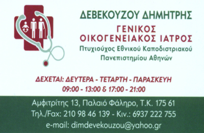 customer tabsΕπικοινωνία2η Διέυθ.: Αφαίας 25, Αίγινα, τηλ.: 2297500455Παλαιό Φάληρο δέχεται: Δευτέρα - Τετάρτη - Παρασκευή 09:00-13:00 & 17:00-21:00Αίγινα δέχεται: Τρίτη - Πέμπτη 09:00-13:00 & 17:00-21:00 ΣΥΝΤΟΜΟ ΒΙΟΓΡΑΦΙΚΟΔΕΒΕΚΟΥΖΟΥ ΔΗΜΗΤΡΙΟΣΕΙΔΙΚΟΣ ΓΕΝΙΚΟΣ ΙΑΤΡΟΣΕκ Κωνσταντινουπόλεως ορμώμενος, απόφοιτος της Ιατρικής σχολής του Πανεπιστημίου Αθηνών. Η εκπαίδευση του, η θητεία του σε μεγάλα νοσοκομεία των Αθηνών καθώς και η συμμετοχή του σε διεθνή σεμινάρια και συνέδρια του επιτρέπουν να εφαρμόζει σύγχρονες τεχνικές σε ευρύ φάσμα της παθολογίας όπως: Δυσλιπιδαιμία,Αρτηριακή Υπέρταση,ΧΑΠ,Παχυσαρκία,Κατάθληψη,Σακχαρώδης Διαβήτης,Οστεοπόρωση,Διακοπή καπνίσματος,Άνοια ,Λοιμώξεις κλπ.Γενική ΙατρικήΥγείαΑμφιτρίτης 13, Παλαιό ΦάληροΠΑΛΑΙΟ ΦΑΛΗΡΟ ΑΤΤΙΚΗΣΑΙΓΙΝΑ ΑΤΤΙΚΗΣΑΤΤΙΚΗΠΕΙΡΑΙΑΣ ΑΤΤΙΚΗΣ 2109846139 2297500455 69372227552109846139dimdevekouzou@yahoo.gr Το προτείνω (έχει προταθεί 2 φορές) ΦωτογραφίεςΠροσφορές ΔΙΑΒΗΤΗΣ ΔΥΣΛΙΠΙΔΑΙΜΙΑ,ΥΠΕΡΤΑΣΗ,ΧΑΠ,ΚΑΤΑΘΛΗΨΗ,ΠΑΧΥΣΑΡΚ,Facebook LikeShare on FacebookTweet Widget