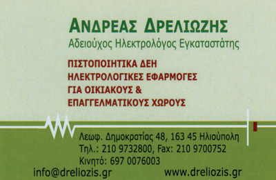 customer tabsΕπικοινωνίαΣτο κατάστημά μας θα βρείτε μεγάλη ποικιλία σε ηλεκτρολογικό υλικό,λάμπες, μπαταρίες, φωτιστικά, μικροσυσκευές και πολλά άλλα.Δείτε αναλυτικά τα προϊόντα μας στις παρακάτω κατηγορίες :Φωτιστικά και ΛάμπεςΗλεκτρολογικός ΕξοπλισμόςΟικιακές συσκευέςΘερμαντικά σώματαΤηλεπικοινωνίεςΓια ζεστό νερόΗλεκτρολογικά ΥλικάΗλεκτρολογικά Είδη και ΥλικάΦωτιστικάΗλεκτρικές Συσκευές Οικιακής ΧρήσηςΔόμηση - ΚατοικίαΛεωφόρος Δημοκρατίας 48, ΗλιούποληΗΛΙΟΥΠΟΛΗ ΑΤΤΙΚΗΣΑΤΤΙΚΗ 2109732800 6944324299 69700760032109700752info@dreliozis.grwww.dreliozis.grΔρελιώζης Ν. Ανδρέας Το προτείνω (έχει προταθεί 0 φορές) ΦωτογραφίεςFacebook LikeShare on FacebookTweet Widget