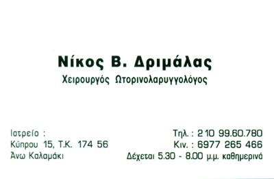 customer tabsΕπικοινωνίαΩράριο: Τρίτη & Πέμπτη 17:30 -20:00 με ραντεβούΩτορινολαρυγγολόγοιΥγείαΚύπρου 15, Άνω Καλαμάκι, ΑττικήΑΘΗΝΑ ΑΤΤΙΚΗΣΑΤΤΙΚΗ 2109960780 6977265466 Το προτείνω (έχει προταθεί 0 φορές) ΦωτογραφίεςFacebook LikeShare on FacebookTweet Widget