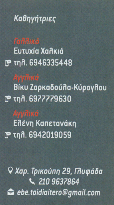 customer tabsΕπικοινωνίαΑγγλικά, Γαλλικά και Γερμανικά.Άρτια προετοιμασία των μαθητών για τις εξετάσεις τωνπτυχίων όλων των επιπέδων των εξετάσεων του Cambridge και Michigan, Delf,Dalf,SorbonneΠροετοιμασία στο ειδικό μάθημα (Πανελλήνιες Εξετάσεις)και στα πτυχία IELTS, TOEFL, TOEIC, BULATS (πιστοποίηση γλώσσαςσε Αγγλόφωνα Πανεπιστήμια και ΑΣΕΠ)Μαθήματα και το καλοκαίρι.Ένας δημιουργικός τρόπος γιακάλυψη κενών με έμφαση στην προφορική και τη γραπτήεξάσκηση, αλλά και κάλυψη ολόκληρης τάξης!Αποκλειστική μέθοδος για την εκμάθηση της γραφής και της ανάγνωσης σε Pre-Juniors/Begginers.Κέντρα Ξένων ΓλωσσώνΕκπαίδευσηΧαριλάου Τρικούπη 29, ΓλυφάδαΓΛΥΦΑΔΑ ΑΤΤΙΚΗΣΑΤΤΙΚΗ 21096378642109637864ebe.toidiaitero@gmail.comΦροντιστήριο Ξένων Γλωσσών-"Τo Ιδιαίτερο" Το προτείνω (έχει προταθεί 0 φορές) ΦωτογραφίεςFacebook LikeShare on FacebookTweet Widget