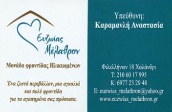 customer tabsΕπικοινωνία 24ωρη ιατρική – Νοσηλευτική φροντίδα Έμπειρο νοσηλευτικό προσωπικό Φυσικοθεραπεία – Εργοθεραπεία σε ειδικά διαμορφωμένο χώρο Ψυχολογική υποστήριξη Επίβλεψη από διαιτολόγο για τις διατροφικές ανάγκες του κάθε ατόμου ξεχωριστάΜονάδες Φροντίδας ΗλικιωμένωνΥπηρεσίεςΦιλελλήνων 18, ΧαλάνδριΧΑΛΑΝΔΡΙ ΑΤΤΙΚΗΣΑΤΤΙΚΗ 2106017995 2106822824 6977232948euzwias_melathron@yahoo.comwww.euzwiasmelathron.gr Το προτείνω (έχει προταθεί 1 φορές) ΦωτογραφίεςFacebook LikeShare on FacebookTweet Widget