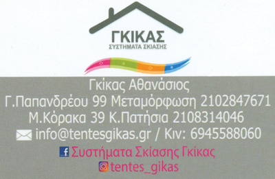 customer tabsΕπικοινωνίαΠροϊόντα: Πέργκολες αλουμινίουΑνοιγοκλεινόμενες περσίδεςΑυτοματισμούςΕιδικές κατασκευέςΔιάφανες τέντεςΠανιάΤέντες παντός τύπουΕίδη εξοχής και κήπουΨηφιακές εκτυπώσεις σε τέντεςΣτόριαΡολλοκουρτίνεςΑναλαμβάνουμε:Μελέτη Επικοινωνήστε μαζί μας τηλεφωνικά είτε μέσω e-mail και θα έρθουμε στον χώρο σας,θα εντοπίσουμε τις ανάγκες σας και χωρίς καμία οικονομική επιβάρυνση και χωρίς δέσμευση.Σχεδίαση Με εμπειρία πολλών χρόνων, έπειτα από ένα πλούσιο πελατολόγιο,μπορούμε να πούμε με σιγουριά πως είμαστε οι καταλληλότεροι νασχεδιάσουμε όσο πιο λειτουργικά γίνεται τη νέα σας τέντα.Εγκατάσταση Έπειτα από προσεκτική μελέτη και σχεδίαση το άρτιακαταρτισμένο τεχνικό προσωπικό κάνει την εγκατάσταση.Εντιμότητα, αξιοπιστία, προσεγμένη και ποιοτική εργασία είναι ένα μέρος της φιλοσοφίας μας.Επισκευή Ράψιμο, πλύσιμο, παντός τύπου επισκευές.Επισκευάζουμε τα πάντα όσο αφορά τις τέντες, και εννοούμε τα πάντα.Έχει φθαρεί ή ξεθωριάσει το τεντόπανό σας; Σας έχει ξηλώσει ο αέρας το πανί;Έχει σκουριάσει ή έχει σπάσει κάποιο εξάρτημα; Απλά, επικοινωνήστε μαζί μας.Συντήρηση Εάν θέλετε να προνοήσετε και να προλάβετε τα σημάδια του χρόνου.Ψηφιακές εκτυπώσεις Σκεφτείτε έξυπνα και αξιοποιήστε τον χώρο μιας τένταςκαταστήματος προσθέτοντας μία επιπλέον υπηρεσία που προσφέρουμε με συνεργαζόμενο κατάστημα,αυτό της ψηφιακής εκτύπωσης και με ένα μικρό κόστος κερδίστε μεγάλο διαφημιστικό πλεονέκτημα.Τέντες και ΣκηνέςΠέργκολεςΔόμηση - ΚατοικίαΓεώργιου Παπανδρέου 99, ΜεταμόρφωσηΚόρακα 39, Πατήσια - ΑθήναΜΕΤΑΜΟΡΦΩΣΗ ΑΤΤΙΚΗΣΑΘΗΝΑ ΑΤΤΙΚΗΣΑΤΤΙΚΗ 2102847671 2108314046 6945588060info@tentesgikas.grwww.tentesgikas.grΣυστήματα Σκίασης Γκίκας Το προτείνω (έχει προταθεί 0 φορές) ΦωτογραφίεςFacebook LikeShare on FacebookTweet Widget