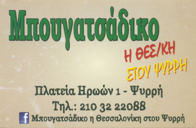 customer tabsΕπικοινωνίαΑπό την Κωνσταντινούπολη στη Θεσσαλονίκη, μετά στο Γκαζοχώρι, ύστερα στη πλατεία Κουμουνδούρου και τώρα στου Ψυρρή.Υποκατάστημα: Σουβλάκι - Το Παλιό ΨυρρήΤηλ: 2103213131, Μιαούλη 27, ΨυρρήInstagram: bougatsadiko_psiriΜπουγάτσαΚαφέδεςΚαφενεία - Καφετέριες - Καφέ Μπαρ - ΜπαρΔιασκέδαση - ΕστίασηΤουρισμόςΛοιπάΠλατεία Ηρώων 1, ΨυρρήΑΘΗΝΑ ΑΤΤΙΚΗΣΑΤΤΙΚΗ 2103222088bougatsadiko@gmail.comΜπουγατσάδικο η Θεσσαλονίκη στου Ψυρρή - Bougatsadiko psirri Το προτείνω (έχει προταθεί 1 φορές) ΦωτογραφίεςFacebook LikeShare on FacebookTweet Widget