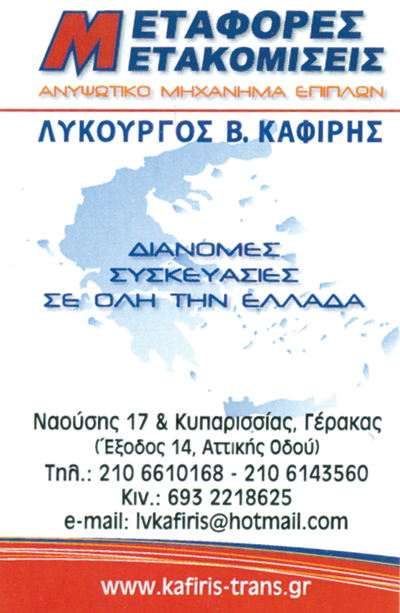 customer tabsΕπικοινωνίαΜετακομίσεις και ΜεταφορέςΥπηρεσίεςΝαούσης 17 & Κυπαρισσίας, Γέρακας, ΑττικήΓΕΡΑΚΑΣ ΑΤΤΙΚΗΣΑΤΤΙΚΗ 2106143560 2106610168 69322186252106610168lvkafiris@hotmail.comwww.kafiris-trans.gr Το προτείνω (έχει προταθεί 0 φορές) ΦωτογραφίεςFacebook LikeShare on FacebookTweet Widget