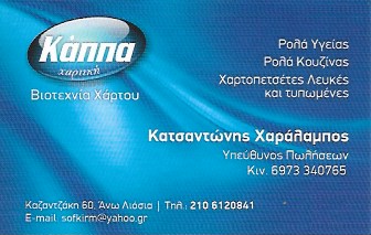 customer tabsΕπικοινωνίαΗ εταιρεία μας ασχολείται με την παραγωγή διαφόρων ειδών χαρτοπετσέτας, χαρτιού υγείαςκαι κουζίνας.Στόχος μας η απόλυτη ικανοποίηση των επιθυμιών και αναγκών του πελάτη,με συνέπεια και υψηλή ποιότητα προιόντων.Η πολυετής εμπειρία μας στην παραγωγή ειδώνχαρτιού και η γνώση της αγοράς, αποτελούν την καλύτερη εγγύηση για να μας εμπιστευθείτε.Επεξεργασία ΧαρτιούΛοιπάΚαζαντζάκη 60, Ανω ΛιόσιαΑΝΩ ΛΙΟΣΙΑ ΑΤΤΙΚΗΣΑΤΤΙΚΗ 2106120841 6973340765kappaxartiki@gmail.comkappa-chartiki.webnode.com Το προτείνω (έχει προταθεί 0 φορές) ΦωτογραφίεςFacebook LikeShare on FacebookTweet Widget