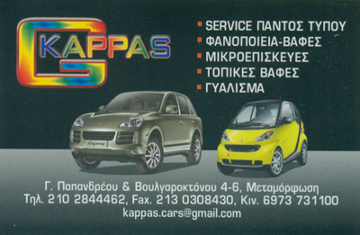 customer tabsΕπικοινωνίαΔραστηριοποιούμαστε στο χώρο εδώ και 30 χρόνια και σας προσφέρουμε με τον καλύτερο και πιο οικονομικό τρόπο τις υπηρεσίες μας με Πρωτοποριακές μεθόδους. Χρησιμοποιούμε ασφαλή τεχνολογία, με σύγχρονα μηχανήματα και ερχόμαστε να σας αποδείξουμε για άλλη μια φορά την τεχνογνωσία μας πάνω στο αντικείμενο, με το άρτιο προσωπικό που εργάζεται με γνώμονα την καλύτερη εξυπηρέτησή σας αλλά και τη δική μας περαιτέρω ανάπτυξη.Σας περιμένουμε στο φιλικό και καθαρό περιβάλλον μας, εγγύησή μας οι ικανοποιημένοι πελάτες μας!!!Service παντός τύπουΦανοποιία - βαφέςΜικροεπισκευέςΤοπικές βαφέςΓυάλισμαΕυθυγράμμισηΧαλαζόπτωσηΣτεγανοποιήσειςΜονώσεις Φανοποιία και ΒαφέςAUTO - MOTOΓεωργίου Παπανδρέου 134 και Βασ. Βουλγαρικτόνου 4-6, Μεταμόρφωση, ΑττικήΜΕΤΑΜΟΡΦΩΣΗ ΑΤΤΙΚΗΣΑΤΤΙΚΗ 2102844462 6973731100kappas.cars@gmail.comhttp://www.kappascars.gr Το προτείνω (έχει προταθεί 0 φορές) ΦωτογραφίεςFacebook LikeShare on FacebookTweet Widget