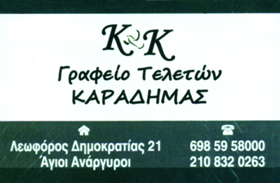 customer tabsΕπικοινωνίαΓραφεία ΤελετώνΥπηρεσίεςΛ. Δημοκρατίας 21, Αγιοι ΑνάργυροιΑΓΙΟΙ ΑΝΑΡΓΥΡΟΙ ΑΤΤΙΚΗΣΑΤΤΙΚΗ 2108320263 6985958000info@karadimas-teletes.grwww.karadimas-teletes.gr Το προτείνω (έχει προταθεί 0 φορές) ΦωτογραφίεςFacebook LikeShare on FacebookTweet Widget
