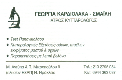 customer tabsΕπικοινωνίαΜέλος της Ελληνικής εταιρείας Κλινικής ΚυτταρολογίαςΜέλος της Ομοιοπαθητικής ΑκαδημίαςΔιαγνωστικές, κυτταρολογικές εξετάσεις.ΚυτταρολόγοιΥγείαΠαναγιώτη Μικρόπουλου 9, Νέο ΗράκλειοΗΡΑΚΛΕΙΟ ΑΤΤΙΚΗΣΑΤΤΙΚΗ 2102795084 6944363037 Το προτείνω (έχει προταθεί 0 φορές) ΦωτογραφίεςFacebook LikeShare on FacebookTweet Widget