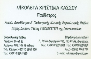 customer tabsΕπικοινωνίαΑναπλ. Διευθύντρια Παιδιατρικής Κλινικής Ευρωκλινικής ΠαίδωνΙατρός Δικτύου Υγείας MEDISYSTEMΠαιδίατροιΥγείαΛεωφ. Αγίου Δημητρίου 275, Αγ. Δημήτριος ΑττικήςΑΓΙΟΣ ΔΗΜΗΤΡΙΟΣ ΑΤΤΙΚΗΣΑΤΤΙΚΗ 2109859881 6932243719nckassou@gmail.comΠαιδιατρικό Ιατρείο 275 Το προτείνω (έχει προταθεί 0 φορές) ΦωτογραφίεςFacebook LikeShare on FacebookTweet Widget