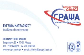 customer tabsΕπικοινωνίαΑγγλικά, Γαλλικά, Γερμανικά, Ιταλικά, Ισπανικά.Καθηγητές Ξένων ΓλωσσώνΚέντρα Ξένων ΓλωσσώνΕκπαίδευσηΘεομήτορος 55, ΆλιμοςΑΛΙΜΟΣ ΑΤΤΙΚΗΣΑΤΤΙΚΗ 2109848320 6981488940alimos@grapsa.edu.gr Το προτείνω (έχει προταθεί 1 φορές) ΦωτογραφίεςFacebook LikeShare on FacebookTweet Widget