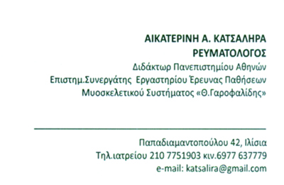 customer tabsΕπικοινωνίαΔέχεται κατόπιν ΡαντεβούΡευματολόγοιΥγείαΠαπαδιαμαντοπούλου 42, ΙλίσιαΙΛΙΣΙΑ ΑΤΤΙΚΗΣΑΤΤΙΚΗ 2107751903 6977637779katsalira@gmail.com Το προτείνω (έχει προταθεί 1 φορές) ΦωτογραφίεςFacebook LikeShare on FacebookTweet Widget