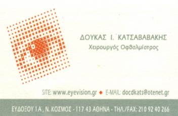 customer tabsΕπικοινωνίαΟ Κ. Κατσαβαβάκης γεννήθηκε το 1957 στην Αλεξανδρούπολη. Αποφοίτησε το 1982 από την ιατρική σχολή παν. Αθηνών. Εκπαιδεύτηκε στο Οφθαλμιατρείο Αθηνών και έλαβε τον τίτλο ειδικότητας της Οφθαλμολογίας τον Σεπτέμβριο (1991). Διετέλεσε επί τριετία επιστημονικός συνεργάτης της Παν/κής Οφθαλ/κής Κλινικής στο τμήμα Αμφιβληστροειδούς-LASER όπου εξειδικεύτηκε στην ψηφιακή Φλουοραγγειογραφία, Ινδοκυανίνη και στην εφαρμογή των LASER στον οφθαλμό. Από το 2002 είναι επιστημονικός συνεργάτης, υπεύθυνος τμήματος ψηφιακής Φλουοραγγειογραφίας στο Νοσ. Metropolitan. Είναι εξειδικευμένος στην επέμβαση Καταρράκτη μικρής τομής με φακοθρυψία και στη Διαθλαστική Χειρουργική με Excimer Laser για τη διόρθωση των διαθλαστικών ανωμαλιών.Είναι μέλος της:Ελληνικής Οφθαλμολογικής εταιρείαςΕλληνικής Εταιρείας Ενδοφακών και Διαθλαστικής Χειρουργικής.Ευρωπαϊκής Εταιρείας Χειρουργών Καταρράκτη και Διαθλαστικής χειρουργικής.Έχει πλούσιο συγγραφικό έργο με πολλές ανακοινώσεις σε Οφθαλ/κά περιοδικά, σε ελληνικά, διεθνή Οφθαλ/κά Συνέδρια και μετάφραση της Επίτομης Οφθαλμολογίας του Kanski.Συνεργάζεται με το Νοσοκομείο Metropolitan, την Κεντρική Κλινική Αθηνών και το Αθηναϊκό Διαθλαστικό κέντρο.Πιστοποιημένος ΕΟΠΥΥΔιαγνωστικές εξετάσειςΠλήρες οφθαλμολογικό check upΑ-Β υπερηχογραφίαΥπερηχητική βιομετρίαΒυθοσκόπηση και ψηφιακή φωτογράφιση βυθού χωρίς μυδρίασηΠαχυμετρία κερατοειδούςΤοπογραφίαΟπτική τομογραφία συνοχής (OCT)Οπτικά πεδίαΦλουοροαγγειογραφία - ICG στο Νοσοκομείο MetropolitanΕφαρμογές LaserΔιόρθωση Μυωπίας, Υπερμετρωπίας, Αστιγματισμού με ExcimerLaser (Αθηναϊκό Διαθλαστικό Κέντρο)Φωτοπηξία Green Laser παθήσεων ΑμφιβληστροειδούςYAG laser για τη θόλωση του οπισθίου περιφακίουΧειρουργικές επεμβάσειςΕγχείρηση καταρράκτη με υπερήχουςΕγχείρηση ΓλαυκώματοςΕγχείρηση Πτερυγίου, Χαλαζίου, Ογκιδίων βλεφάρου, ΞανθελασμάτωνΕνδοβολβικές ενέσεις αντί - Vegf παραγόντων.Δέχεται καθημερινά απόγευμα 17:30 -21:00Εκτός Παρασκευής με ραντεβού ΟφθαλμίατροιΥγείαΕυδόξου 1α, Νέος Κόσμος, ΑττικήΝΕΟΣ ΚΟΣΜΟΣ ΑΘΗΝΩΝΑΤΤΙΚΗ 2109240266 6932710495info@eyevision.grwww.eyevision.gr Το προτείνω (έχει προταθεί 0 φορές) ΦωτογραφίεςFacebook LikeShare on FacebookTweet Widget