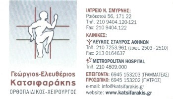 customer tabsΕπικοινωνίαΟρθοπεδικοί ΙατροίΧειρούργοι ΟρθοπεδικοίΥγείαΡαιδεστού 56, Νέα ΣμύρνηΝΕΑ ΣΜΥΡΝΗ ΑΤΤΙΚΗΣΑΤΤΙΚΗ 2109404120 2109404121 6945153202 (Ιατρός) 6945153203 (Γραμματέας)2109404122info@katsifarakis.grwww.katsifarakis.gr Το προτείνω (έχει προταθεί 0 φορές) ΦωτογραφίεςFacebook LikeShare on FacebookTweet Widget