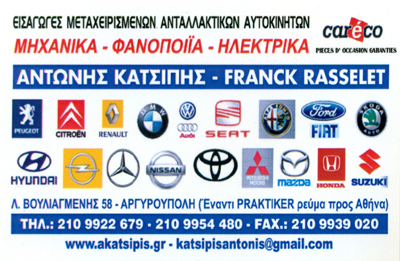 customer tabsΕπικοινωνίαΜεταχειρισμένα ανταλλακτικά.Αυτοκινήτων ΑνταλλακτικάAUTO - MOTOΛεωφόρος Βουλιαγμένης 58, Αργυρούπολη, ΑττικήΑΡΓΥΡΟΥΠΟΛΗ ΑΤΤΙΚΗΣΑΤΤΙΚΗ 2109922679katsipisantonis@gmail.comwww.akatsipis.gr Το προτείνω (έχει προταθεί 0 φορές) ΦωτογραφίεςFacebook LikeShare on FacebookTweet Widget