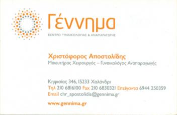 customer tabsΕπικοινωνίαΔέχεται κατόπιν ραντεβού.Διεύθυνση: Λ. Κηφισίας 346, 2ος όροφος, Εντός Κέντρου Γονιμότητας Γέννημα, Χαλάνδρι (Έναντι νοσοκομείο Υγεία)Μαιευτήρες - ΓυναικολόγοιΥγείαΛ. Κηφισίας 346, Εντός Κέντρου Γονιμότητας Γέννημα, ΧαλάνδριΧΑΛΑΝΔΡΙ ΑΤΤΙΚΗΣΑΤΤΙΚΗ 2106830311 2106830321 2106830831 6944250359info@gennima.grgennima@otenet.grwww.gennima.gr Το προτείνω (έχει προταθεί 0 φορές) ΦωτογραφίεςFacebook LikeShare on FacebookTweet Widget