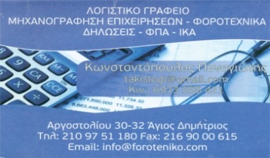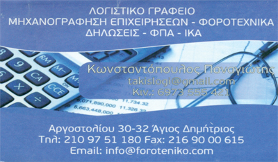 customer tabsΕπικοινωνίαΛογιστικές- Φοροτεχνικές ΥπηρεσίεςΥπηρεσίεςΑργοστολίου 30-32, Αγ. ΔημήτριοςΑΓΙΟΣ ΔΗΜΗΤΡΙΟΣ ΑΤΤΙΚΗΣΑΤΤΙΚΗ 2109751180 6973555421takislogi@gmail.com Το προτείνω (έχει προταθεί 1 φορές) ΦωτογραφίεςFacebook LikeShare on FacebookTweet Widget