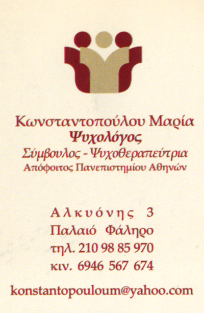 customer tabsΕπικοινωνίαΣυμβουλευτική και ψυχοθεραπεία σε παιδιά και εφήβους,συμβουλευτική και ατομική ψυχοθεραπεία σε γονείς και ενήλικες.Καθημερινά Πρωί και Απόγευμα κατόπιν ραντεβούΨυχολόγοιΥγείαΑλκυονής 3, Παλαιό Φάληρο, ΑττικήΠΑΛΑΙΟ ΦΑΛΗΡΟ ΑΤΤΙΚΗΣΑΤΤΙΚΗ 2109885970 6946567674konstantopouloum@yahoo.com Το προτείνω (έχει προταθεί 0 φορές) ΦωτογραφίεςFacebook LikeShare on FacebookTweet Widget