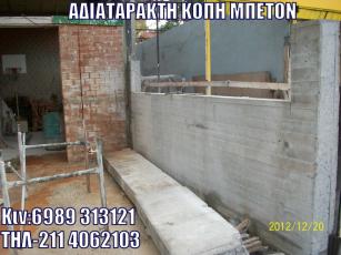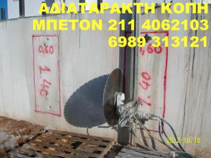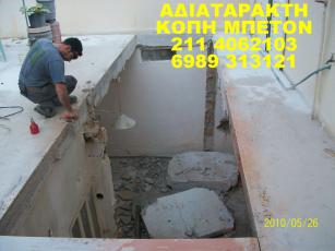 Η εταιρία ZAKO εισήγαγε τηνΑΔΙΑΤΑΡΑΚΤΗ ΚΟΠΗ σκυροδέματος. Μία σύγχρονη τεχνική στις κατεδαφίσεις, καθαιρέσεις και κοπές του μπετόν χωρίς θόρυβο και χωρίς σκόνη.Η ZAKO έχει πετύχει μια σταθερά ανοδική πορεία, αυξάνοντας καθημερινά τον όγκο εργασιών της. Παρέχει ολοκληρωμένες τεχνικές λύσεις, επιτυγχάνοντας ταυτόχρονα ταχύτατους ρυθμούς εκτέλεσης, στη πιο κοντινή σχέση κόστους και αποτελέσματος. Με εξειδίκευση και συνέπεια μπορεί και ανταγωνίζεται με σταθερή αξία τη σχετική με το είδος αγορά Η εταιρία μας είναι εξοπλισμένη με την τελευταία λέξη της τεχνολογίας, ενώ τα εξειδικευμένα εργαλεία που διαθέτουμε, καλύπτουν απόλυτα οποιαδήποτε ανάγκη στο χώρο ΑΔΙΑΤΑΡΑΚΤΗ ΚΟΠΗ ΜΠΕΤΟΝ, ΔΙΑΤΡΗΣΗ ΜΠΕΤΟΝ καθώς και ενισχύσεις κτηρίων. Η εταιρία μας είναι πρωτοπόρος εταιρία στο χώρο ΑΔΙΑΤΑΡΑΚΤΗ ΚΟΠΗ ΜΠΕΤΟΝ, ΔΙΑΤΡΗΣΗ ΜΠΕΤΟΝ. Οι υπηρεσίες μας - Στρογγυλές οπές για σωληνώσεις-Η εταιρία έχει την τεχνολογία καθώς και την τεχνογνωσία διάνοιξης οπών σε όλα τα δομικά υλικά. - Διανοίξεις σε κάθετες επιφάνειες για καινούριες πόρτες και παράθυρα Τετράγωνες οπές για ανελκυστήρες και κλιμακοστάσια Η εταιρία εξοπλισμένη με τα πλέον σύγχρονα μηχανήματα σε συνδυασμό με το έμπειρο προσωπικό έχει την δυνατότητα κοπής όλων των δομικών υλικώνσε οποιοδήποτε πάχος. Συρματοκοπή Ανθρακονήματα - ΥαλοϋφάσματαΤσιμεντενέσεις - Ρητινενέσεις Κοπή τυφλού τμήματος οπλισμένου μπετόνΓενικευμένη χρήση μέσων αδιατάρακτης κοπής για την ελεγχομένη κατεδάφιση κτιρίων ή μέρους αυτών.Αναλαμβάνουμε σε όλη την Ελλάδα κάθε τεχνική εργασία και εξυπηρετούμε κάθε ανάγκη της Αδιατάρακτη Κοπη και Διάτριση μπετόν σε πολυκατοικίας, του διαμερίσματος σας ή του επαγγελματικού χώρου σας, οπως εργοστασια και παρκιν. Αποξήλωση των παλαιών (μεσοτοιχίες, κουζίνες, μπάνια, πόρτες & κουφώματα, δάπεδα / πατώματα, κλπ.)ΦΤΗΝΟΤΕΡΗ ΠΡΟΤΑΣΗ ΣΤΗΝ ΑΓΟΡΑ Οι δραστηριότητες μας δεν περιορίζονται στην Αττική όπου εδρεύει, αλλά επεκτείνονται σε όλη την Ελλάδα. Το γραφείο μας, σε οποιαδήποτε κλίμακα έργου, διαθέτει συνέπεια, ταχύτητα, ποιοτική εκτέλεσης εργασιών και χαμηλό κόστος. Για να μας ζητήστε προσφορά η περισσότερα πληροφορίας Τηλ/Fax:2114062103 Κιν:6989 313121