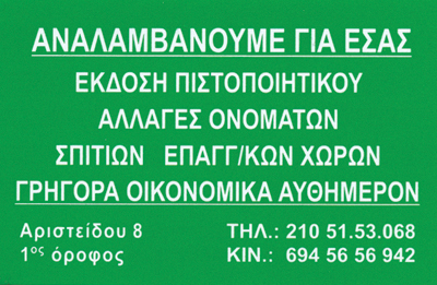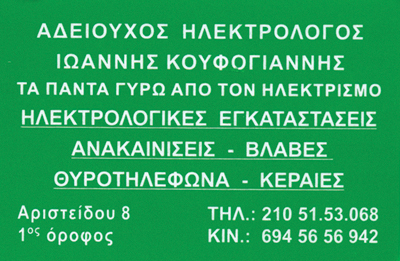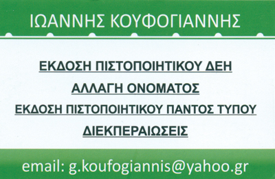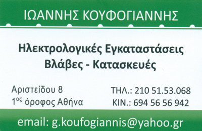 customer tabsΕπικοινωνίαΓραφειο Διεκπεραιώσεων (αλλαγεs oνοματων σε σπιτια και επαγγελματικουs χωρουs)Ηλεκτρολογικεs Εργασιεs - ΒλάβεςΠιστοποιητικα Για Tη ΔΕΗΗλεκτρολόγοιΗλεκτρολογικές ΕγκαταστάσειςΔόμηση - ΚατοικίαΑριστείδου 8ΑΘΗΝΑ ΑΤΤΙΚΗΣΑΤΤΙΚΗ 2105153068 6945656942g.koufogiannis@yahoo.grwww.grigora-oikonomika.grΙωάννης κουφογιαννης Το προτείνω (έχει προταθεί 1 φορές) ΦωτογραφίεςFacebook LikeShare on FacebookTweet Widget