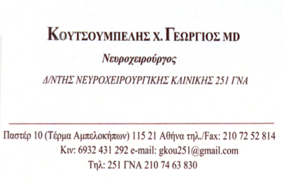 customer tabsΕπικοινωνίαO Νευροχειρουργός Γεώργιος Κουτσουμπέλης είναι Διευθυντής της Νευροχειρουργικήςκλινικης του 251 Γενικού Νοσοκομείου Πολεμικής Αεροπορίας ,είναι εξειδικευμένοςστο Ηνωμένο Βασίλειο (UK), μετεκπαιδεύτηκε στην Πανεπιστημιάκη κλινικήΝευροχειρουργικής και Ορθοπαιδικής στην Köln Γερμανίας ένω έχει παρακολουθήσειειδικά εκπαιδευτικά σεμινάρια σε Γερμανία, Αυστρία και Ελβετίαπάνω στην Ενδοσκοπική χειρουργική της Σπονδυλικής Στήλης.Ο ιατρός διατηρεί σύγχρονο ιατρείο και πραγματοποιεί σύγχρονες τεχνικές,οι οποίες αυξάνουν την ακρίβεια και αποτελεσματικότητα της θεραπείαςκαι μειώνουν τον πόνο και το χρόνο αποκατάστασης.Διαθέτοντας μεγάλη εμπειρία στο χώρο, ο ιατρός πραγματοποιεί ένα ευρύφάσμα χειρουργικών επεμβάσεων που αφορούν τον εγκέφαλο,τη σπονδυλική στήλη και τα περιφερικά νεύρα.Οσφυϊκή δισκοκήληΑυχενική δισκοκήλη, αυχενική σπονδύλωση, μυελοπάθειαΟστεοπορωτικά κατάγματαΟγκολογία νωτιαίου μυελούΟγκολογία εγκεφάλουΑκτινοχειρουργικήΚακώσεις κεντρικού νευρικού συστήματοςΑστάθειες σπονδυλικής στήλης, στενώσεις σπονδυλικού σωλήναΠαιδονευροχειρουργικήΕνδοεγκεφαλικά αιματώματαΣπονδυλοδεσίαΣύνδρομο καρπιαίου σωλήναΝευροχειρουργοίΥγείαΠαστέρ 10, ΑθήναΝοσοκομείο Αεροπορίας: Λεωφόρος Κανελλοπούλου 3, Γούδι - ΑθήναΑΘΗΝΑ ΑΤΤΙΚΗΣΑΜΠΕΛΟΚΗΠΟΙ ΑΤΤΙΚΗΣΑΤΤΙΚΗ 2107252814 2107463830 6932431292gkou251@gmail.comwww.endospine.grwww.drkoutsoubelis.gr Το προτείνω (έχει προταθεί 0 φορές) ΦωτογραφίεςFacebook LikeShare on FacebookTweet Widget