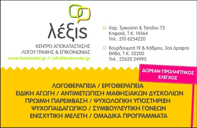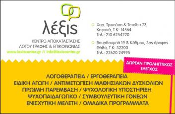 Το Κέντρο Λόγου Γραφής και Επικοινωνίας λέξις, είναι ένας χώρος αξιολόγησης κι αποκατάστασης δυσκολιών που αφορούν στο παιδί, στον ενήλικα και στην οικογένεια καθώς επίσης και ένας χώρος για την προαγωγή του παιχνιδιού, τη δημιουργική απασχόληση όπου και έχει αναγνωριστεί ως προϋπόθεση για την υγιή ανάπτυξη των νοητικών, κοινωνικών και ψυχικών δεξιοτήτων των παιδιών.