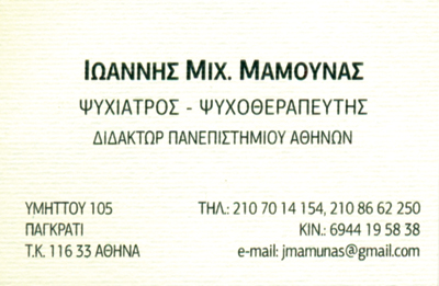 customer tabsΕπικοινωνία2η διεύθυνση: Οιδίποδος 41, Θήβα.Δέχεται καθημερινά, κατόπιν ραντεβού.ΨυχίατροιΨυχοθεραπευτέςΥγείαΥμηττού 105, Παγκράτι, ΑττικήΠΑΓΚΡΑΤΙ ΑΤΤΙΚΗΣΑΤΤΙΚΗ 2107014154 6944195838gmamunas@gmail.com Το προτείνω (έχει προταθεί 0 φορές) ΦωτογραφίεςFacebook LikeShare on FacebookTweet Widget