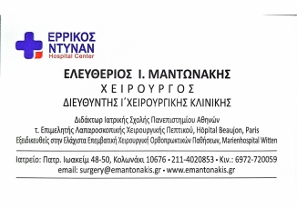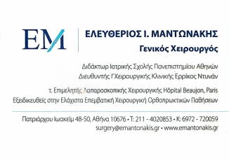 customer tabsΕπικοινωνίαΛαπαροσκοπική χολοκυστεκτομήΛαπαροσκοπική αποκατάσταση κηλών (βουβωνοκήλη, μηροκήλη, ομφαλοκήλη)Λαπαροσκοπική σκωληκοειδεκτομήΑντιμετώπιση αιμορροΐδωνΑντιμετώπιση περιεδρικών συρριγίων-αποστημάτωνΚύστη ΚόκκυγοςΕπεμβάσεις Λεπτού & Παχέος ΕντέρουΟ Ελευθέριος Μαντωνάκης αποφοίτησε από την Ιατρική Σχολή του Πανεπιστημίου Αθηνών και ειδικεύτηκε στη Γενική Χειρουργική στην Α’ Χειρουργική Κλινική του Πανεπιστημίου Αθηνών. Μετεκπαιδεύτηκε στη Λαπαροσκοπική Χειρουργική του Πεπτικού και της Παχυσαρκίας στα Πανεπιστημιακά Νοσοκομεία Beaujon και Georges-Pompidou στο Παρίσι. Δέχεται κατόπιν ραντεβού στην οδό Πατριάρχου Ιωακείμ 48-50 στο Κολωνάκι και χειρουργεί στο Ερρίκος Ντυνάν Hospital Center. Ο Χειρουργός και το Νοσοκομείο ακολουθούν όλα τα διεθνή πρότυπα και διαδικασίες σχετικά με την αντιμετώπιση των παθήσεων και την ασφάλεια του ασθενούς. Γενικοί ΧειρουργοίΥγείαΠατριάρχου Ιωακείμ 48-50, Κολωνάκι, ΑθήναΑΘΗΝΑ ΑΤΤΙΚΗΣΑΤΤΙΚΗ 2114020853surgery@emantonakis.grwww.emantonakis.grΕλευθέριος Μαντωνάκης - Χειρουργός Το προτείνω (έχει προταθεί 1 φορές) ΦωτογραφίεςFacebook LikeShare on FacebookTweet Widget