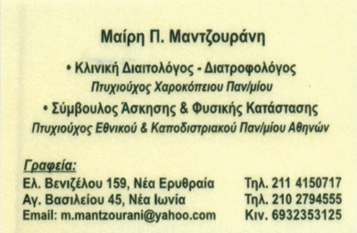 customer tabsΕπικοινωνία2) Αγ. Βασιλείου 45, Νέα ΙωνίαΔιαιτολόγοι - ΔιατροφολόγοιΥγείαΕλ. Βενιζέλου 159, Νέα ΕρυθραίαΝΕΑ ΕΡΥΘΡΑΙΑ ΑΤΤΙΚΗΣΑΤΤΙΚΗ 2114150717 2102794555 6932353125m.mantzourani@yahoo.com Το προτείνω (έχει προταθεί 1 φορές) ΦωτογραφίεςFacebook LikeShare on FacebookTweet Widget