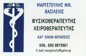 Ο Μαργετούλης Νικ. Βασίλειος γεννήθηκε στον Πειραιά το 1981.Το 2012 ολοκλήρωσε τις σπουδές του στο Ανώτατο Τεχνολογικό Εκπαιδευτικό Ίδρυμα (Α.Τ.Ε.Ι.) Πάτρας στις σχόλες Υγείας και Πρόνοιας στο τμήμα Φυσικοθεραπείας. Από το 2004 εξασκεί το επάγγελμα του φυσικοθεραπευτή εργαζόμενος σε κέντρα αποκατάστασης, αθλητικά κέντρα, φυσικοθεραπευτήρια, μονάδες φροντίδας ηλικιωμένων ( Μ.Φ.Η ), καθώς και μέχρι σήμερα αναλαμβάνει την αποκατάσταση ασθενών στο σπίτι. Είναι μέλος του Πανελλήνιου Συλλόγου Φυσικοθεραπευτών και των επιστημονικών τμημάτων καρδιοαγγειακής και αναπνευστικής φυσικοθεραπείας και αποκατάστασης στην Μονάδα Εντατικής Θεραπείας ( Μ.Ε.Θ ) και Γηριατρικής. Είναι επίσης συμβεβλημένος φυσικοθεραπευτής του ΕΟΠΥΥ.