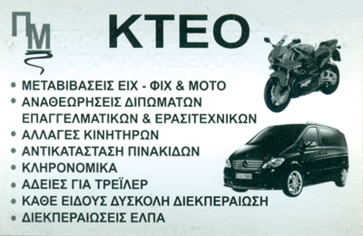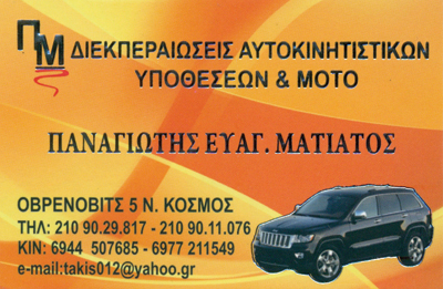 customer tabsΕπικοινωνίαΜετά την 25ετή εμπειρία μας στο χώρο του αυτοκινήτου, της μοτοσυκλέτας και φορτηγών, είμαστε σίγουροι ότι σε εμάς θα βρείτε εμπιστοσύνη, εχεμύθεια, γρήγορη εξυπηρέτηση και με χαμηλό κόστος παροχής υπηρεσιών.Το γραφείο μας εξυπηρετεί εταιρείες και ιδιώτες σε όλο το λεκανοπέδιο της Αττικής. Με το δυναμικό προσωπικό που έχουμε ερχόμαστε στην έδρα σας.Έχοντας γνώση την κρίση που περνάει ο κλάδος του αυτοκινήτου και της μοτοσυκλέτας, προσπαθούμε και εμείς με τον τρόπο μας να κατεβάσουμε τις τιμές, ώστε να μην υπάρχει μεγάλο κόστος αμοιβής για τις ταξινομήσεις και μεταβιβάσεις των αυτοκινήτων και μοτοσυκλετών.Μερικές απ τις υπηρεσίες που προσφέρουμε:Κ.Τ.Ε.Ο. ΕΙΧ & ΜοτοΜεταβιβάσεις ΕΙΧ & ΜοτοΕξαγωγές ΕΙΧ & ΜοτοΑλλαγές ΚινητήρωνΑντικατάσταση ΠινακίδωνΆδειες ΤρέϊλερΚληρονομικάΔιεκπεραιώσεις ΕΛΠΑ Μεταβιβάσεις ΟχημάτωνΤεχνικός Έλεγχος Αυτοκινήτων (ΚΤΕΟ)Διεκπεραιώσεις Αυτοκινητιστικών ΥποθέσεωνAUTO - MOTOΥπηρεσίεςΟβρένοβιτς 5, Νέος Κόσμος, ΑττικήΑΘΗΝΑ ΑΤΤΙΚΗΣΝΕΟΣ ΚΟΣΜΟΣ ΑΘΗΝΩΝΔΑΦΝΗ ΑΤΤΙΚΗΣΝΕΑ ΣΜΥΡΝΗ ΑΤΤΙΚΗΣΚΑΛΛΙΘΕΑ ΑΤΤΙΚΗΣΑΤΤΙΚΗ 2109029817 6944507685takis012@yahoo.grwww.matiatos-panos.gr Το προτείνω (έχει προταθεί 1 φορές) ΦωτογραφίεςFacebook LikeShare on FacebookTweet Widget