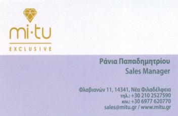 customer tabsΕπικοινωνίαΣτην εταιρεία μας που βρίσκεται στη Νέα Φιλαδέλφεια θα βρείτε κομμάτια ποιοτικά , διαλεγμένα από ανθρώπους με γούστο & άποψη και είναι πάντα η λαμπερή λεπτομέρεια σε κάθε σας έξοδο.Τα αξεσουάρ μας είναι ιδανικά για γυναίκες που θέλουν να αναδείξουν το ιδιαίτερο και μοναδικό στυλ τους ! Γυναικεία αξεσουάρΤσαντάκια, φάκελοι κ.α.Πορτοφόλια - ΜπρελόκΦουλάρια - Κασκόλ - ΓάντιαΚοσμήματα - ΜπιζούΚολιέ, μενταγιόν, βραχιόλια, σκουλαρίκια, δαχτυλίδιαΠασμίνες, μαντήλια, εσάρπεςΑξεσουάρ μαλλιώνΕνδυμάτων Είδη και ΑξεσουάρΛοιπάΦλαβιανών 11 - Νέα ΦιλαδέλφειαΝΕΑ ΦΙΛΑΔΕΛΦΕΙΑ ΑΤΤΙΚΗΣΑΤΤΙΚΗ 2102527590sales@mitu.grwww.mitu.gr Το προτείνω (έχει προταθεί 1 φορές) ΦωτογραφίεςFacebook LikeShare on FacebookTweet Widget