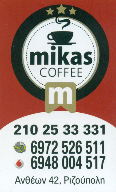 customer tabsΕπικοινωνίαΚαφέδεςΚαφετέριαΦρέσκοι ΧυμοίΣάντουιτςDelivery CafeCoffee ΚαφέδεςΚαφενεία - Καφετέριες - Καφέ Μπαρ - ΜπαρΦαγητό στο Σπίτι (Delivery)ΧυμοίΣνακΛοιπάΔιασκέδαση - ΕστίασηΤουρισμόςΑνθέων 42 Ριζούπολη, ΑθήναΑΘΗΝΑ ΑΤΤΙΚΗΣΑΤΤΙΚΗ 2102533331 6972526511aist123@yahoo.grmikas coffee Το προτείνω (έχει προταθεί 2 φορές) ΦωτογραφίεςFacebook LikeShare on FacebookTweet Widget
