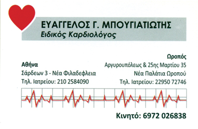 customer tabsΕπικοινωνία1η Διεύθυνση :Νέα Φίλαδέλφεια Δέχεται Δευτέρα, Τρίτη, Πέμπτη, Παρασκευή 10:00 - 14:00 και 17:00 - 20:00 κατόπιν ραντεβού.2η Διεύθυνση: Νέα Παλάτια Ωρωπού Δέχεται Τετάρτη και Σάββατο κατόπιν ραντεβού. ΚαρδιολόγοιΥγείαΣαρδεών 3, 1ος όροφος, Νέα Φιλαδέλφεια, ΑττικήΑργυρουπόλεως και 25ης Μαρτίου 35, 3ος όροφος, Νέα Παλάτια Ωρωπού, ΑττικήΝΕΑ ΦΙΛΑΔΕΛΦΕΙΑ ΑΤΤΙΚΗΣΩΡΩΠΟΣ ΑΤΤΙΚΗΣΑΤΤΙΚΗ 2102584090 6972026838ampougiatiotis@hotmail.gr Το προτείνω (έχει προταθεί 0 φορές) ΦωτογραφίεςFacebook LikeShare on FacebookTweet Widget