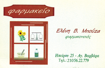 customer tabsΕπικοινωνίαΦαρμακευτικά προϊόντα, ορθοπεδικά, είδη bebe, καλλυντικά, συμπληρώματα διατροφής.ΦαρμακείαΥγείαΗπείρου 25, Αγία ΒαρβάραΑΓΙΑ ΒΑΡBΑΡΑ ΑΤΤΙΚΗΣΑΤΤΙΚΗ 2105622779elenimpouza@hotmail.gr Το προτείνω (έχει προταθεί 0 φορές) ΦωτογραφίεςFacebook LikeShare on FacebookTweet Widget