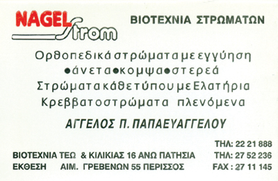 customer tabsΕπικοινωνίαΤα στρώματα της Nagel Strom σάς ανοίγουν την καρδιά τους!Ορθοπαιδικά στρώματα: Κατά κύριο λόγο, τα ορθοπαιδικά στρώματααποτελούνται από ελατήρια συνδεδεμένα μεταξύ τους τα οποία ονομάζουμε Bonnel Springs.Έτσι, επιτυγχάνουμε την καλή υποστήριξη της σπονδυλικής στήλης,προκειμένου να μην κυρτώνει κατά τη διάρκεια του ύπνου.Ανατομικά στρώματα: Κατά κύριο λόγο, τα ανατομικά στρώματααποτελούνται από ανεξάρτητα ελατήρια, τα λεγόμενα Pocket Springs,λειτουργώντας ανεξάρτητα στην πίεση του κάθε σημείου του σώματος.Έτσι, η σπονδυλική στήλη μένει ξεκούραστη στη διάρκεια όλου του ύπνου,διατηρώντας τη φυσική καμπύλη της.Όλα όσα θέλετε να μάθετε για το στρώμα σας.Η Υγιεινή του Στρώματος: Ένα στρώμα με το οποίο ερχόμαστε καθημερινά σε επαφή,οφείλουμε να το διατηρούμε καθαρό και σε άριστη κατάσταση.Αυτό είναι υψίστης σημασίας, γιατί σύμφωνα με πρόσφατες μελέτεςαποδείχτηκε ότι ακόμα και σε ένα σχετικά καθαρό περιβάλλον μπορούν νααναπτυχθούν μέχρι και 2.000.000 μικροοργανισμοί ακάρεων στο διάστημα 8 ετών περίπου.Τα ακάρεα σκόνης είναι υπεύθυνα και για κάποιες ασθένειεςόπως το άσθμα ή ακόμα και κάποιες αλλεργίες.ΣτρώματαΜαξιλάριαΔόμηση - ΚατοικίαΚιλικίας 18 & Τεώ, Αθήνα - Άνω ΠατήσιαΑΘΗΝΑ ΑΤΤΙΚΗΣΑΤΤΙΚΗ 2102221888nagelstrom@hol.grwww.nagelstrom.gr Το προτείνω (έχει προταθεί 0 φορές) ΦωτογραφίεςFacebook LikeShare on FacebookTweet Widget