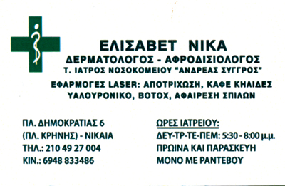 customer tabsΕπικοινωνίαΔερματολόγοι - ΑφροδισιολόγοιΥγείαΠλατεία Δημοκρατίας 6, (πρώην πλατεία Κρίνης), ΝίκαιαΝΙΚΑΙΑ ΑΤΤΙΚΗΣΑΤΤΙΚΗ 2104927004 6948833486vetanika6@yahoo.gr Το προτείνω (έχει προταθεί 0 φορές) ΦωτογραφίεςFacebook LikeShare on FacebookTweet Widget