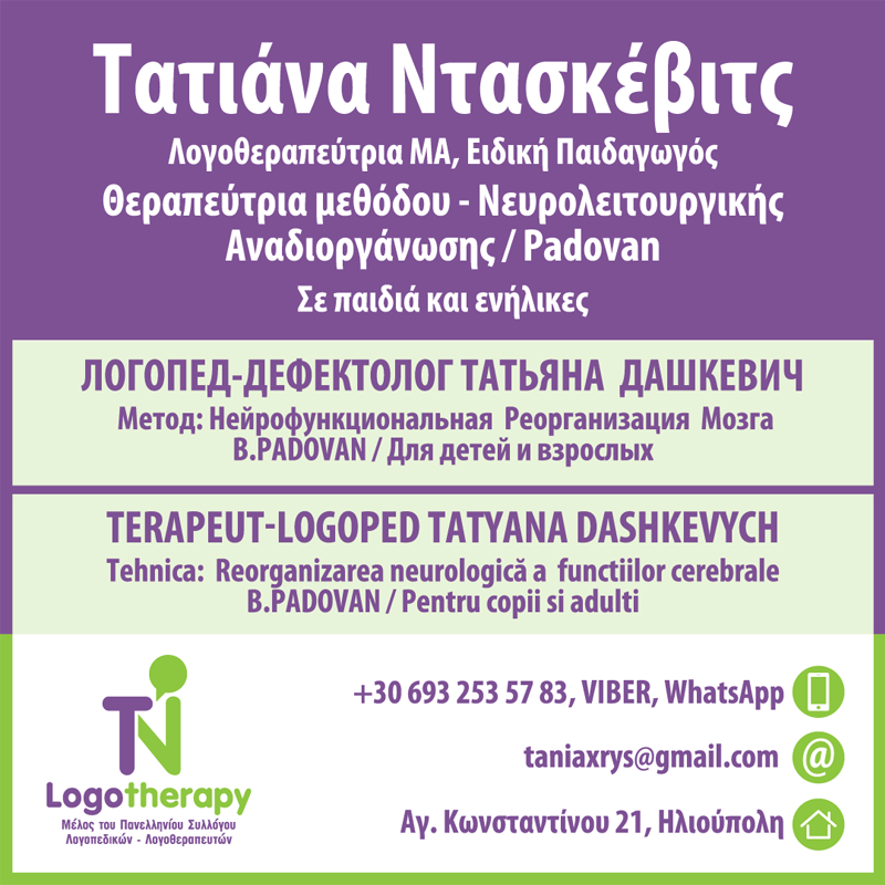 customer tabsΕπικοινωνίαΛογοπεδικός-Λογοθεραπεύτρια Μ.Α.Ειδική Παιδαγωγός. Θεραπεύτρια « Νευρολειτουργικής Αναδιοργάνωση»/ Padovan. Απευθύνεται σε παιδιά, εφήβους και ενήλικες . Διαταραχές λόγου, ομιλίας.ΔυσλεξίαΠροβλήματα μάθησηςΤραυλισμός.ΔυσφαγίαΔυσγραφίαΔυσπραξίαΔΕΠ-ΥΣύνδρομο Down , Αυτισμός.Εγκεφαλικά επεισόδια , Αφασία.Εκφυλιστικές ασθένειες.Καθημερινά με ραντεβού Λογοπεδικοί - ΛογοθεραπευτέςΥγείαΑγ.Κωνσταντίνου 21, ΗλιούποληΚΟΡΩΠΙ ΑΤΤΙΚΗΣΑΤΤΙΚΗ +30 693 253 57 83taniaxrys@gmail.com Το προτείνω (έχει προταθεί 1 φορές) ΦωτογραφίεςFacebook LikeShare on FacebookTweet Widget
