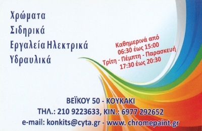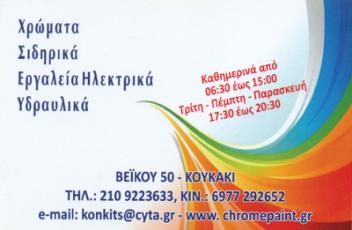 customer tabsΕπικοινωνίαΗ επιχείρησή μας λειτουργεί ανελλιπώς από το 1997και αποτελεί σημείο αναφοράς στο Κουκάκι και στις γύρω περιοχές.Στο κατάστημά μας θα βρείτε όλα τα χρώματα των μεγάλων οίκων,αλλά μπορείτε εξίσου να έχετε και όποια απόχρωση θέλετε.Εμείς θα φτιάξουμε το χρώμα που θέλετε, με βάση τιςεπιθυμίες και τις ανάγκες σας.Επιπλέον, στο κατάστημα θα βρείτε πολλά και διαφορετικά εργαλεία,εξοπλισμό για βαψίματα και κάθε είδους χειρονακτική εργασία καιεπιπλέον, μπορείτε να βρείτε σιδηρικά και άλλο εξοπλισμό,από τα πιο σπάνια μέχρι τα πιο απλά.Λειτουργούμε καθημερινά από τις 06:30 έως τις 15:00και είμαστε πάντοτε στη διάθεσή σας να παρέχουμε κάθε διευκόλυνσηαλλά και πληροφόρηση για τα προϊόντα που προμηθεύεστε από εμάς.Προϊόντα:ΧρώματαΕργαλείαΣιδηρικάΗλεκτρικάΥδραυλικάΕίδη ΚιγκαλερίαςΕίδη ΚαθαρισμούΧρώματα - εργαλεία - μονωτικάΗλεκτρολογικά Είδη και ΥλικάΚιγκαλερίας Είδη και ΥλικάΥδραυλικά Είδη και ΥλικάΔόμηση - ΚατοικίαΒεΐκου 50, Κουκάκι - ΑθήναΑΘΗΝΑ ΑΤΤΙΚΗΣΑΤΤΙΚΗ 2109223633 6977292652konkits@gmail.cominfo@chromepaint.grwww.chromepaint.gr Το προτείνω (έχει προταθεί 0 φορές) ΦωτογραφίεςFacebook LikeShare on FacebookTweet Widget