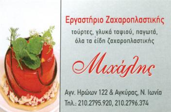 customer tabsΕπικοινωνίαΤούρτες, πάστες, σιροπιαστά.Όλα παραγωγής μας.Αναλαμβάνουμε τούρτες - παστάκια για γάμους.ΖαχαροπλαστείαΔιασκέδαση - ΕστίασηΑγνώστων Ηρώων 122 και Άγκυρας, Νέα Ιωνία, ΑττικήΝΕΑ ΙΩΝΙΑ ΑΤΤΙΚΗΣΑΤΤΙΚΗ 2102795920 2102796374mchatzopoulos21@gmail.comΖαχαροπλαστείο ''Μιχάλης'' Το προτείνω (έχει προταθεί 0 φορές) ΦωτογραφίεςFacebook LikeShare on FacebookTweet Widget