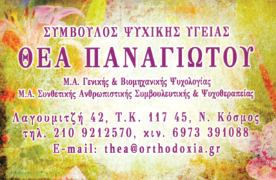 customer tabsΕπικοινωνίαΨυχολόγοιΥγείαΕυρυδάμαντος & Λαγουμιτζή Κωνσταντίνου 42, Νέος ΚόσμοςΝΕΟΣ ΚΟΣΜΟΣ ΑΘΗΝΩΝΑΤΤΙΚΗ 2109212570 6973391088theapanagiotou@gmail.com Το προτείνω (έχει προταθεί 0 φορές) ΦωτογραφίεςΠροσφορές Ψυχολογος-Ψυχοθεραπεύτρια συνθετικής προσέγγισηςFacebook LikeShare on FacebookTweet Widget