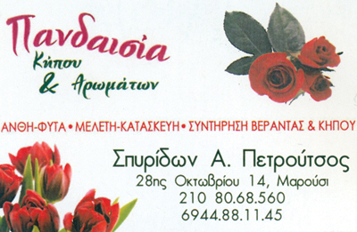 customer tabsΕπικοινωνίαΑνθοπωλείαΚήπων Κατασκευή και ΣυντήρησηΛοιπάΔόμηση - ΚατοικίαΥπηρεσίες28ης Οκτωβρίου 14, ΜαρούσιΜΑΡΟΥΣΙ ΑΤΤΙΚΗΣΑΤΤΙΚΗ 2108068560 6944881145pandaisiakipou@gmail.comΠανδαισία κήπου και αρωμάτων Το προτείνω (έχει προταθεί 0 φορές) ΦωτογραφίεςFacebook LikeShare on FacebookTweet Widget