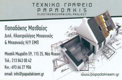customer tabsΕπικοινωνίαΗλεκτρολόγος ΜηχανικόςΤεχνικά Γραφεία και ΕταιρείεςΔόμηση - ΚατοικίαΜιχαϊλ Μωραϊτη 59, ΨυχικόΨΥΧΙΚΟ ΑΤΤΙΚΗΣΑΤΤΙΚΗ 2130430042 6936627906info@papadakisem.grhttp://www.papadakisem.gr/ Το προτείνω (έχει προταθεί 1 φορές) ΦωτογραφίεςFacebook LikeShare on FacebookTweet Widget